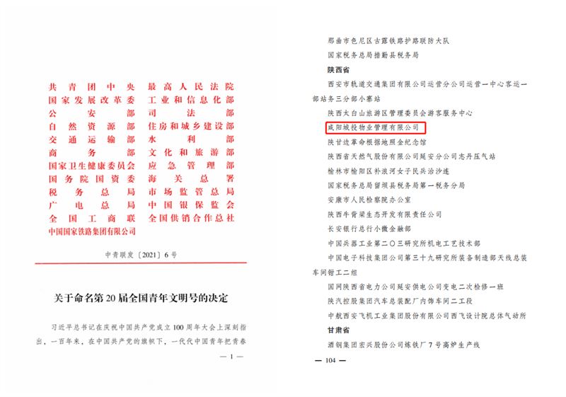 在2019—2020年度全國青年文明號創(chuàng)建評選中,咸陽城投物業(yè)管理有限公司憑借堅定的政治素質(zhì)、良好的職業(yè)道德、專業(yè)的職業(yè)技能、過硬的工作作風(fēng)、優(yōu)秀的崗位業(yè)績獲得“第20屆全國青年文明號”榮譽稱號!